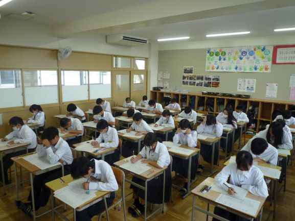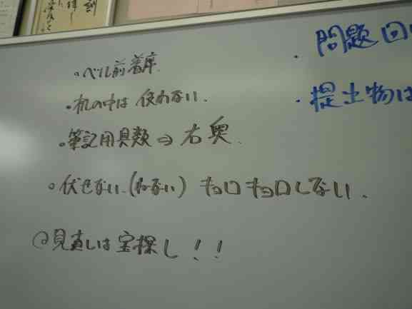 今日、9/26は2学期の中間テストです。事前にテスト勉強の計画を立てて毎日コツコツと家庭学習に取り組んできました。テスト本番で努力の成果を発揮してください。→教室前面の黒板に『見直しは宝探し!』って書いてあるクラスがありました。その通りだと思います。ミスは最大の敵なり!