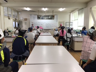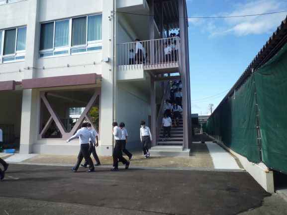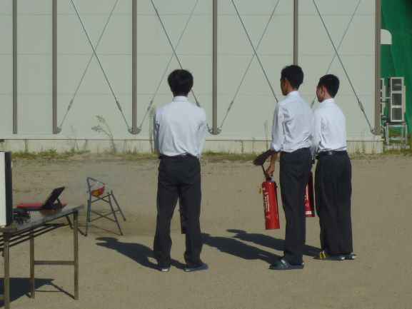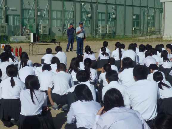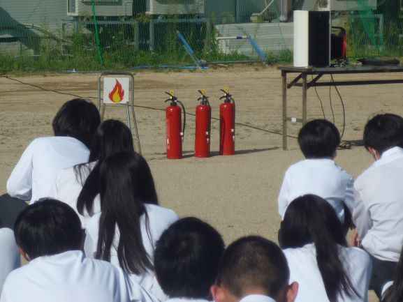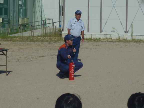 9/26(金)に、火災想定の避難訓練を実施しました。東浅井消防署から2名の消防士さんに来校いただいて訓練の様子を見ていただきました。最初に、各クラスで火事が起こった時の行動について確認を行った後、防災クイズに取り組みました。その後、緊急放送を聞き実際に避難しました。講評の中で「落ち着いて避難ができていました」また、避難の際、上級生が下級生に道を譲り、後から避難をする姿に「譲り合いの気持ちも必要ですね。さすが3年生!です」とコメントをいただきました。最後に、水消火器を使って初期消火の仕方について体験をさせていただきました。