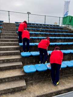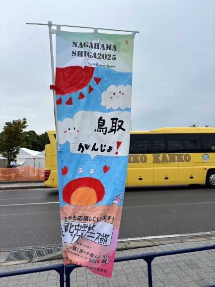 今年は「国スポ・障スポ」が滋賀県開催されています。県内の様々な会場で連日熱戦が繰り広げられています。この週末~週初めは柔道やソフトテニスの種目が長浜市内で開催されています。昨日の日曜日には、本校ソフトテニス部の生徒達が補助役員として長浜城テニスガーデンで行われている競技のお手伝いをしました。前もって制作してくれた都道府県ごとの応援のぼりも会場に設置していただき、選手の皆さんをお出迎えできました。雨の中でしたが、しっかりと競技運営のお手伝いができました。お疲れさまでした。