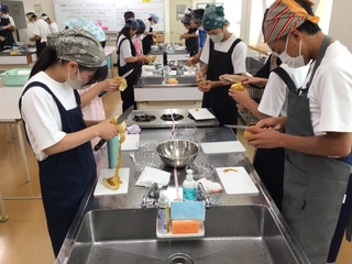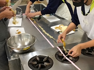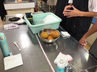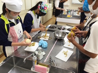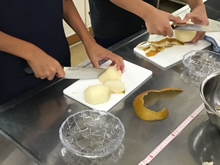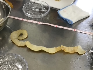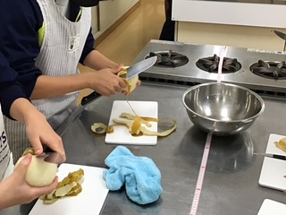 全学年の家庭科の授業で「梨の皮むき選手権」が行われました。子どもたちに正しい包丁の使い方を身に付けてもらうことを目標にしています。ひとり1個の梨が渡され、包丁で皮をむき、きその長さを競います。普段から家で料理のお手伝いをして慣れた手つきで包丁を使える人もいれば、ぎこちない手つきの人もいます。事前に家で皮むきの練習をしてから本番に臨んだ人もいます。幅を細くして薄く均等にむくためには、親指で優しく包丁を抑えながら反対の手で梨を回転させるコツがいります。多くの生徒は悪戦苦闘していました。全校で第1位の記録は、1年生の伊吹さんで2m49㎝でした。おめでとうございます!