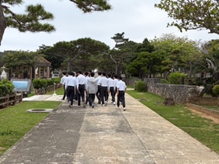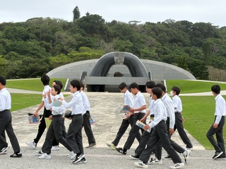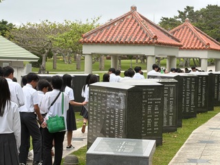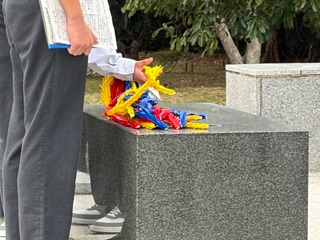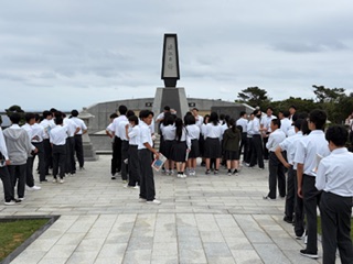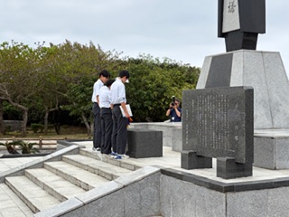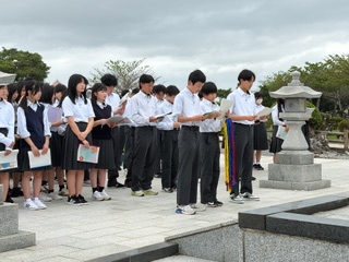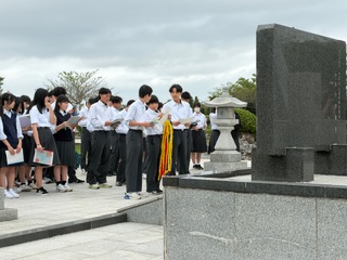 平和祈念公園の近江の塔の前で「平和セレモニー」を行いました。平和宣言を読み上げた後、折り鶴を奉納しました。