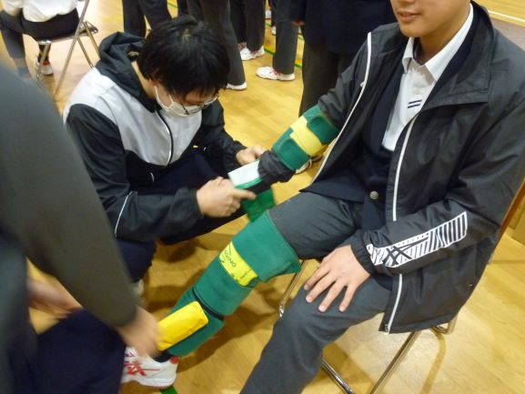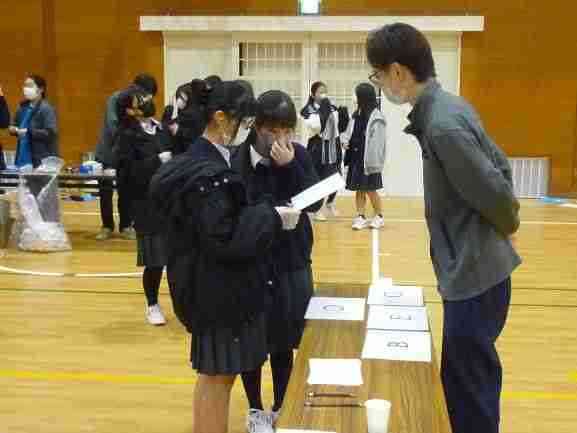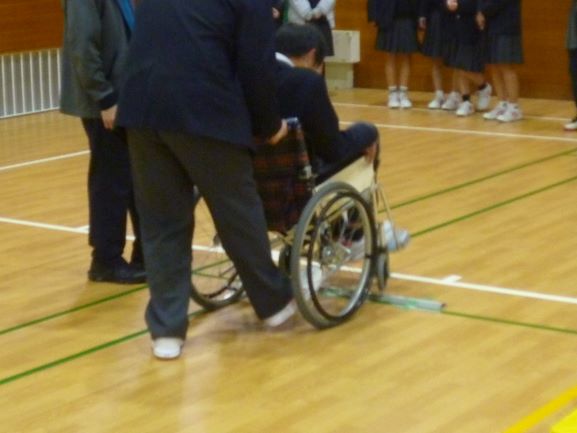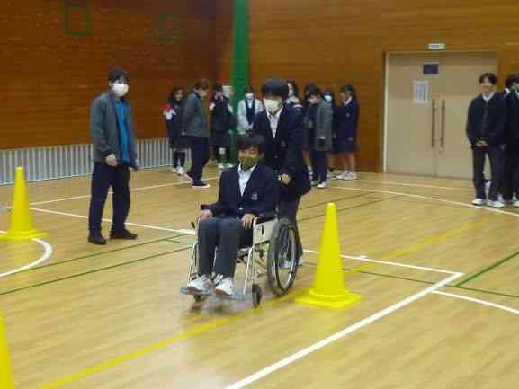 「福祉体験学習(2年)」では、前半に介護福祉分野のお仕事について話を聞きました。後半は、①「車いす体験」②「シニア体験(片麻痺)」③「シニア体験(視聴覚障害)」の3つの疑似体験を通して高齢者の体の特徴を学びました。