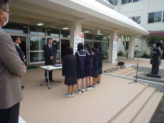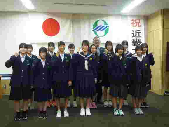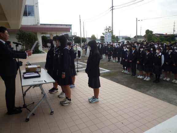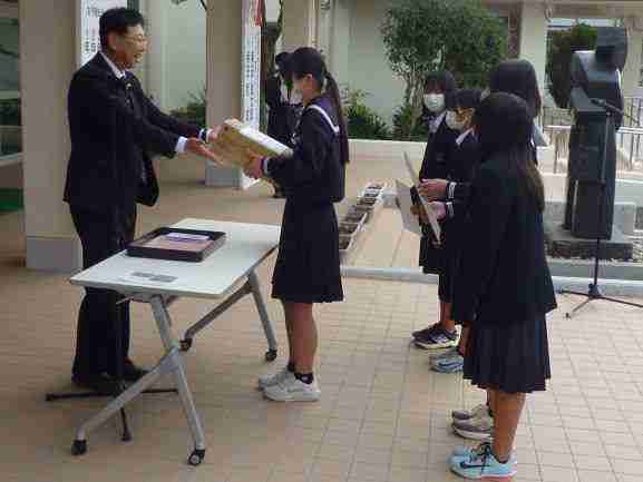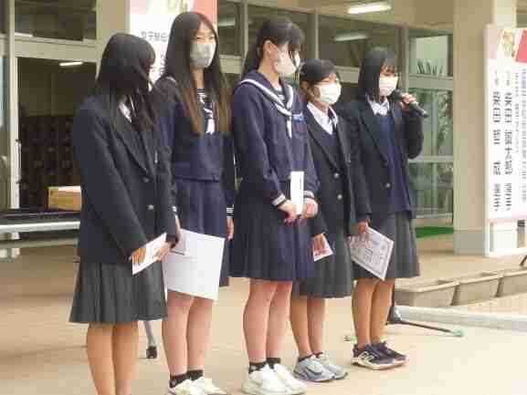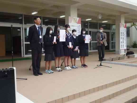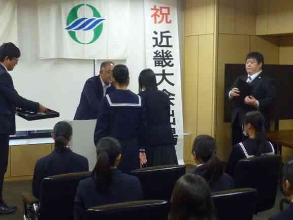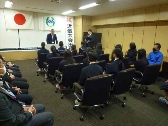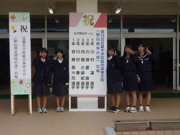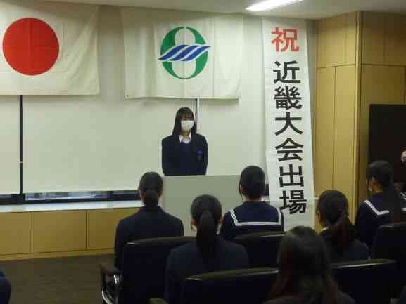 11月27日(木)、昼休みに近畿駅伝競走大会出場を祝して壮行会を実施しました。また、6校時終了後には、長浜市役所でも近畿駅伝競走大会の壮行会を行っていただきました。学校の壮行会は、昇降口前の近畿駅伝応援看板の前で全校生徒が集って行いました。県駅伝の表彰の後、激励品を贈呈し、選手一人ひとりから意気込みを語ってもらいました。堂々とした態度で「頑張ってきます」と述べてくれました。長浜市の壮行会には、本校の女子駅伝メンバーと北中の女子駅伝メンバーが参加しました。織田教育長様より激励のお言葉をいただいたあとに本校と北中の代表者が決意表明を行いました。また、激励品もいただきました。保護者の方々にもご臨席いただいて、子どもたちの晴れ姿を見ていただきました。