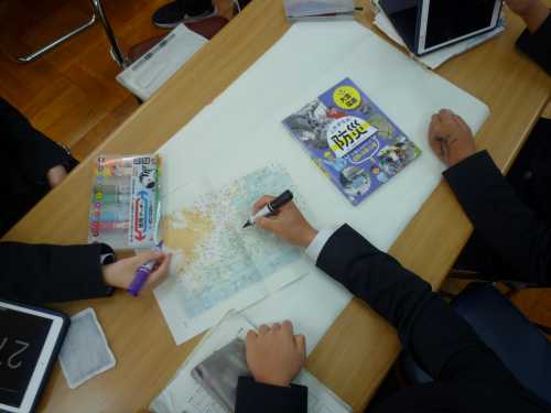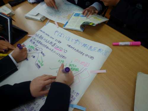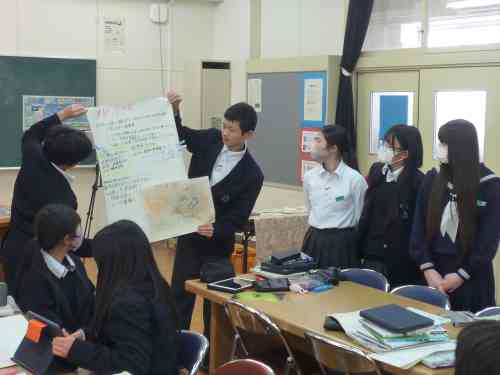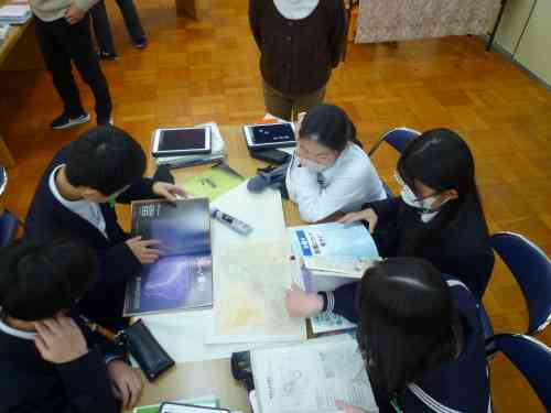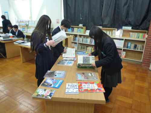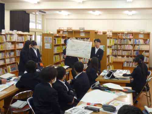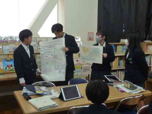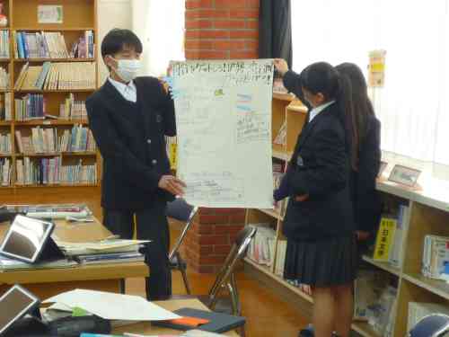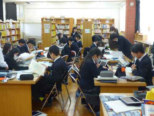 11月に、2年生理科『天気』の単元の導入で、学校図書館を活用した「調べ学習」を行いました。今回は、『天気』の単元のしめくくりで、学校図書館を活用した「まとめ学習」を行いました。気象に関する学習を通して身に付けた力を活用して、グループで協働して調べたり、まとめたり、発表したりしました。具体的なお題は、「過去に大きな被害をもたらした自然災害(気象)の、その当時の天気図を見て、どのような災害(天気)だったのか?どのような被害が出たのか?その天気図の特徴は?などについて、本を調べながら模造紙にまとめプレゼンテーションを行う」というお題です。生徒たちは、意欲を持って主体的に学習に取り組んでいました。人前でもしりごみせず、堂々と発表できていた点も良かったです。