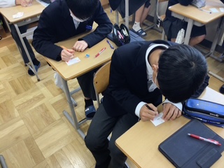 来週の月曜日、火曜日は県内私立高校の入試です。たくさんの人が今回の入試に挑みます。いい表情で落ち着いて入試に取り組んできてください!この日のために計画を立ててコツコツ勉強を頑張ってきました。自分の力を最大限に発揮してきてくださいね。学級では、入試に向けて『合格祈願お守り』を作って入試に備えてきたそうです。名刺大のカードに一人ひとりの名前が書かれています。そのカードの表面、裏面にクラスメイトからの温かいメッセージがぎっしりと書かれています。入試は「団体戦」とも言われます。たくさんの応援で、いっぱい力が湧いてくるはずです!みんななら『できる!できる!必ずできる!』しっかりね。