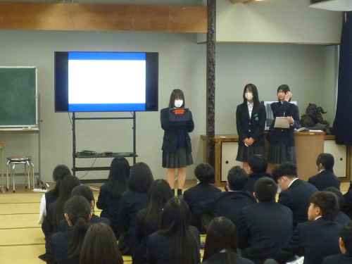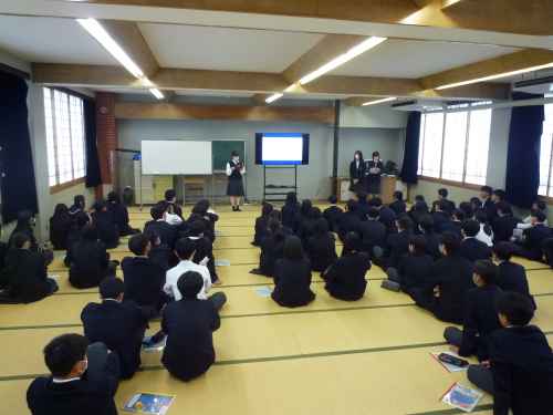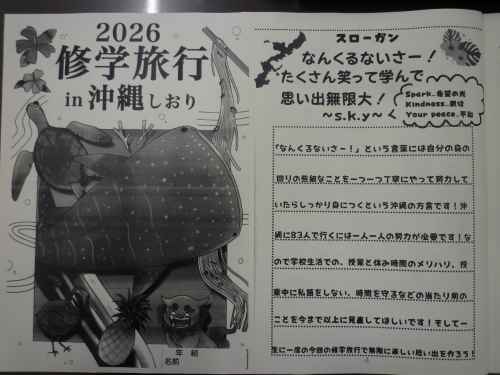 明日4/16(木)から沖縄へ修学旅行にでかけます。今日は旅行前の事前集会がありました。2年生の3学期から実行委員さん中心に事前学習を行ってきましたが、あっという間に前日となりました。スローガンは、『なんくるないさー! たくさん笑って学んで思い出無限大!~s.k.y~』です。「なんくるないさー」は、沖縄の方言で、自分の身の回りの些細なことを一つ一つ丁寧にやって努力すればしっかり身につくという意味だそうです。「s・k・y」は、spark…希望の光、kindness…親切、your peace…平和、の頭文字だそうです。天気予報では沖縄は、明日からの3日間「晴れ」の予報です。3年生のみんなの「日頃のおこない」がいいのでしょうね!ありがたいです!。~保護者の皆様へ~ 修学旅行中も生たちの様子を「湖北中HP」にアップしますので、ぜひご覧ください。