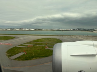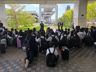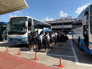 那覇空港に着きました。今バスで出発しました。飛行機が予定より遅れたので、この後の予定を変更して、先に平和祈念公園で平和セレモニーをします。その後に、ガマで入壕体験を行います。生徒たちはみんな元気です。