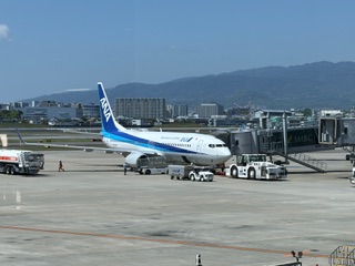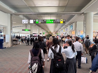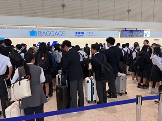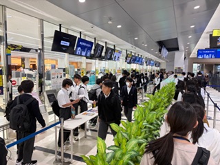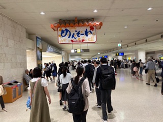 修学旅行1日目です。晴れの良い天気に恵まれました。予定通り伊丹空港に到着し、搭乗券を受け取り、大きな荷物を預けて、その後に手荷物検査を受けました。無事通過して、出発予定時刻11:50まで待ち時間です。