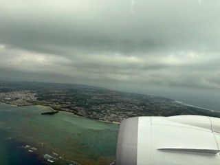 予定より離陸が遅れましたが、一路那覇に飛行中です。飛行機からの眺めも素敵です。到着までの時間でお昼ご飯をいただきます。朝早くから生徒たちのお弁当づくりありがとうございました。