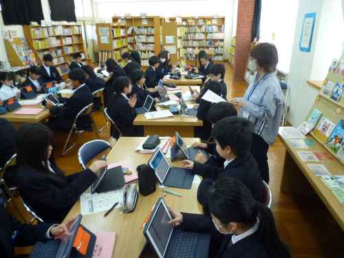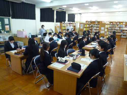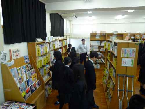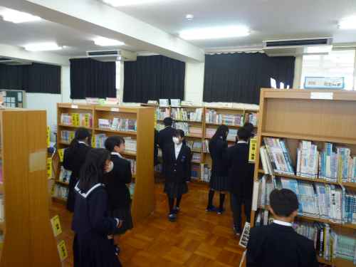4/28(火)、1年生の国語の授業で、学校司書さんから本の借り方や、本の整理のルール、本の検索の仕方などを教えていただきました。説明を聞いた後、生徒たち一人ひとりに「〇〇の本」とお題の書いていてあるカードを渡し、実際に本を探してくる練習をしてもらいました。また、読みたい本を実際に借りてもらいました。たくさんの新書を入れてもらっているので、生徒たちもうれしそうでした。ぜひ読書の楽しさを味わってほしいと思います。